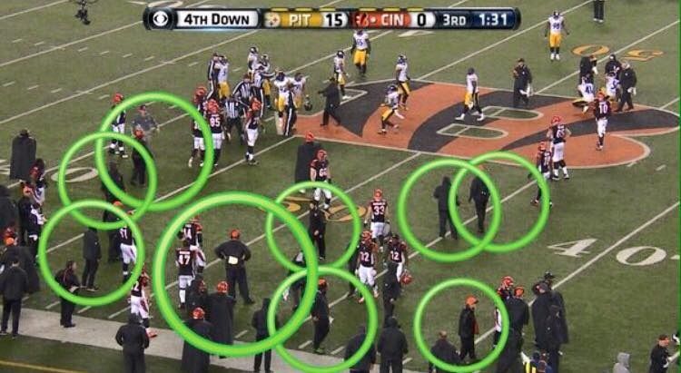 3. The Steelers had fourth-and-3 on their own 41-yard line with just 28 seconds remaining. The Bengals just needed to make one defensive play to win the game. On the snap, the Bengals chose to rush only three defensive lineman. Antonio Brown quickly beat Leon Hall on the play to pick up the first down before taking their third and final timeout.